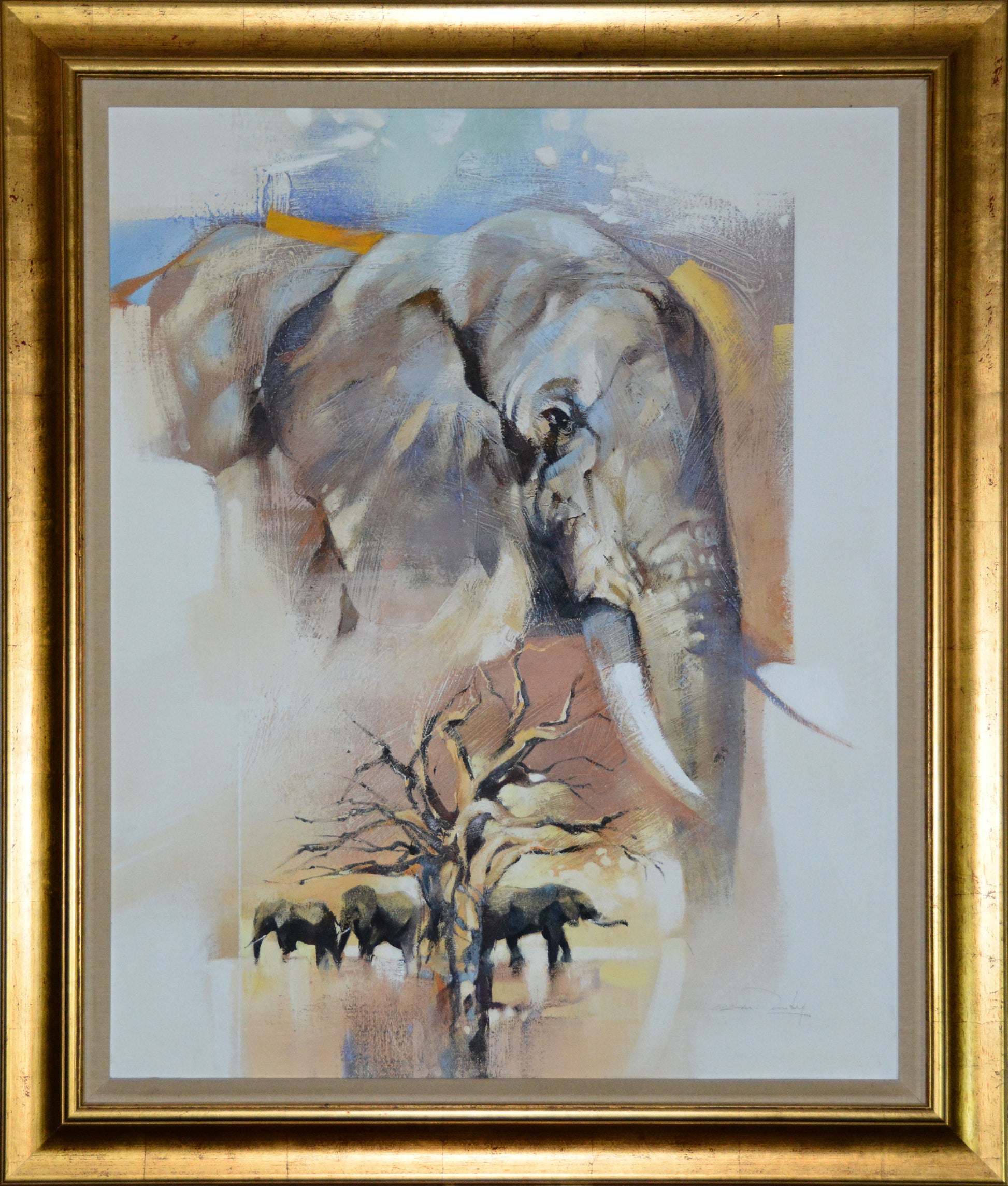 Lovely work from this celebrated South African artist. Huge 110x80cm image size work with lovely striking colours and captivating details. Neatly framed in gold trim. Will work wonderfully in most settings as a reminder of these gentle, graceful creatures.