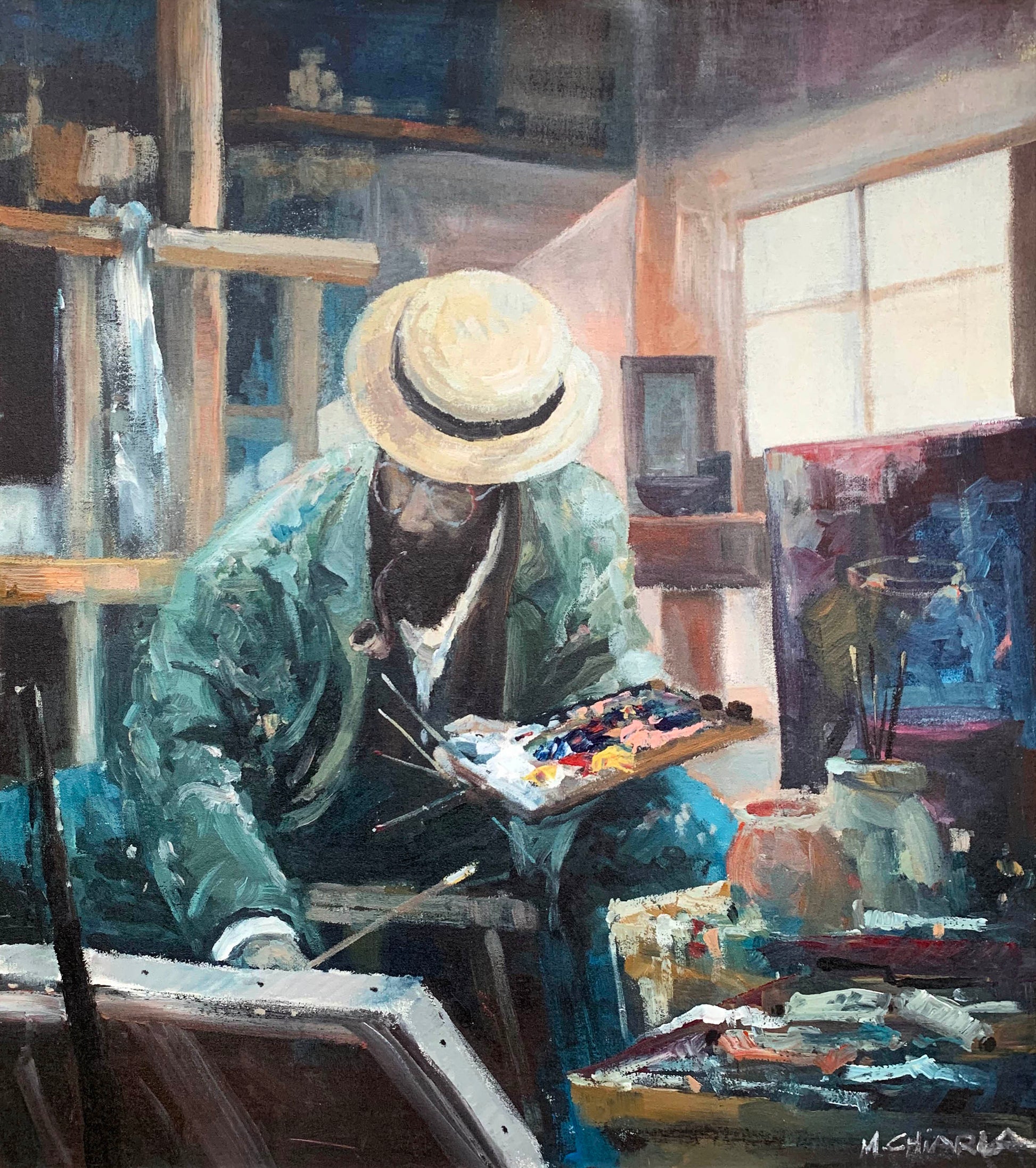 This is a magnificent modern work of an artist in his studio - lovely colours, soft light, neatly framed.