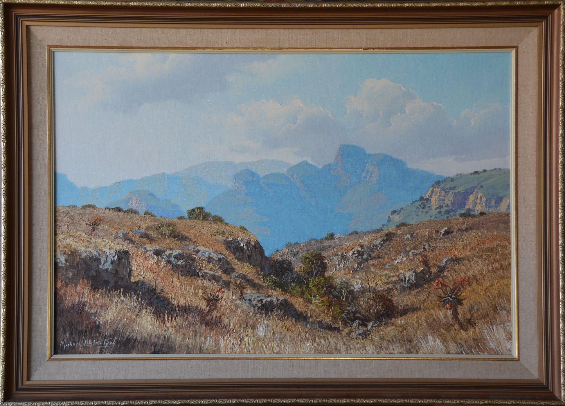 Lovely detailed landscape of this iconic South Afircan setting, from the main maestro of the Albertyn painting family. One of the many successful Albertyn family painters Michael is widely reknowned for his incredible, detailed and almost life like landscapes of his beautiful homeland. Wonderful oil on canvas, 90x60cm in good condition. Lovely details and colours through-out this enchanting work, the pics just do not do it justice, and this is an unbeatable price point for work of this quality!
